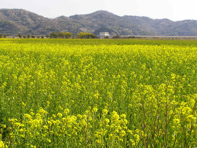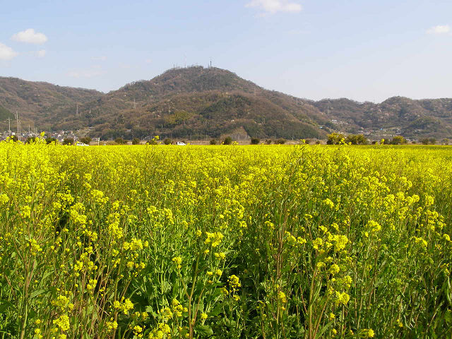 笠岡干拓地の菜の花 毎年この時期に一面の花を咲かせます。 奥の山は栂丸山(塚の丸山)です。