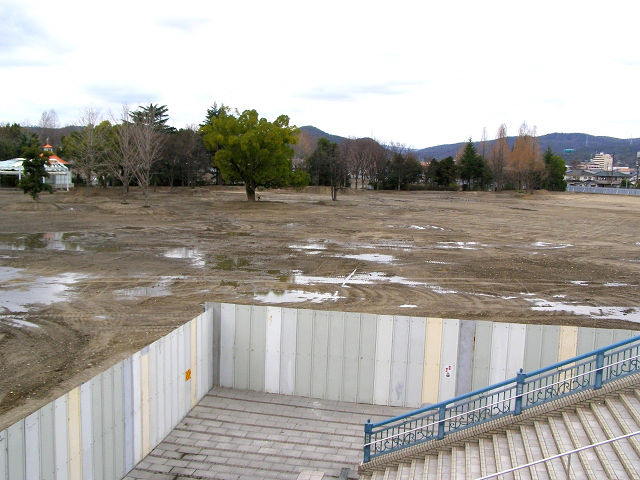 上の写真の反対側、現在の倉敷チボリ公園跡地です。 既存の施設は取り壊され、今までここに夢あふれるテーマパークがあったことなど想像もつかないような、見事な(?)更地になっていました。