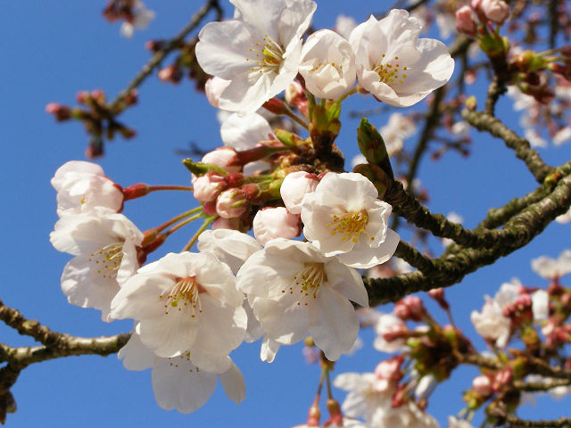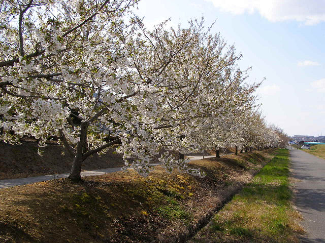 端から端まで歩くと、それだけで往復6~7kmのウォーキングになります。 圧巻なのは、並行して続く堤防沿いに延々と桜の木(オオシマザクラ)が植えられていることです。春には白い花の帯が遥か彼方まで続きます。1000本あるとかないとか。