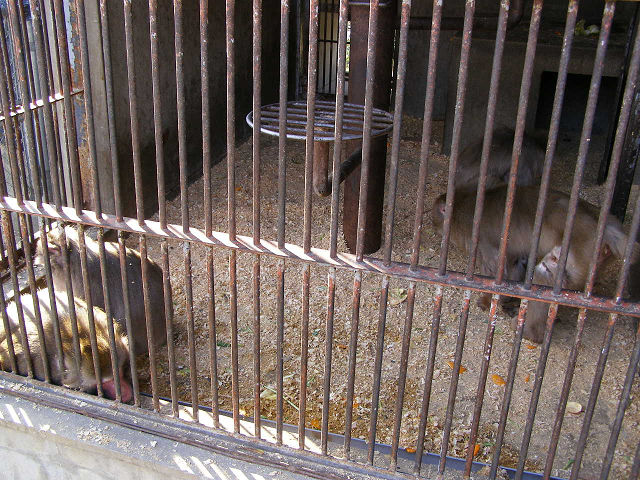 市の管理のもと猿が飼われています。 寒い冬を乗り切って一安心でしょう。隣にはウサギもいます。