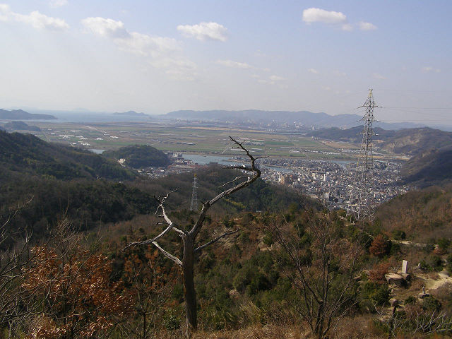 笠岡市街地と干拓地を一望する加入堂山 平成6年に発生した山火事のせいで、まだ所々地肌が露出しています。