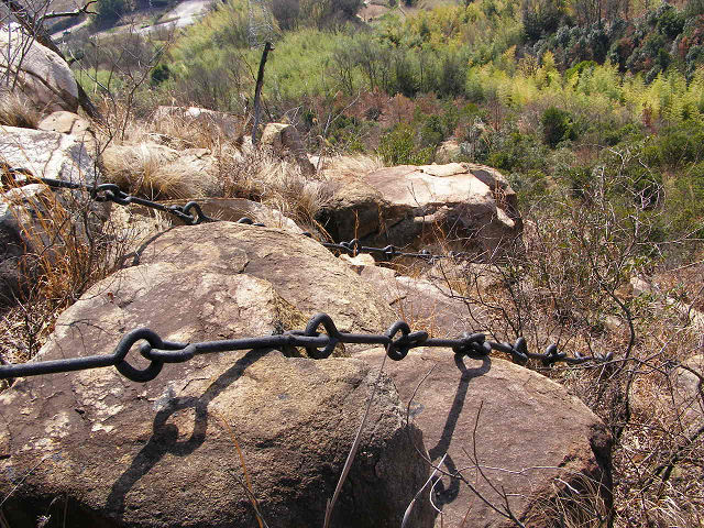 石鎚山らしく修験場を思わせる鎖場 従来の登山ルートとは違う方に続いてます。 岩場自体は大した事はないんですが、枯れ枝が行く手を阻みます。